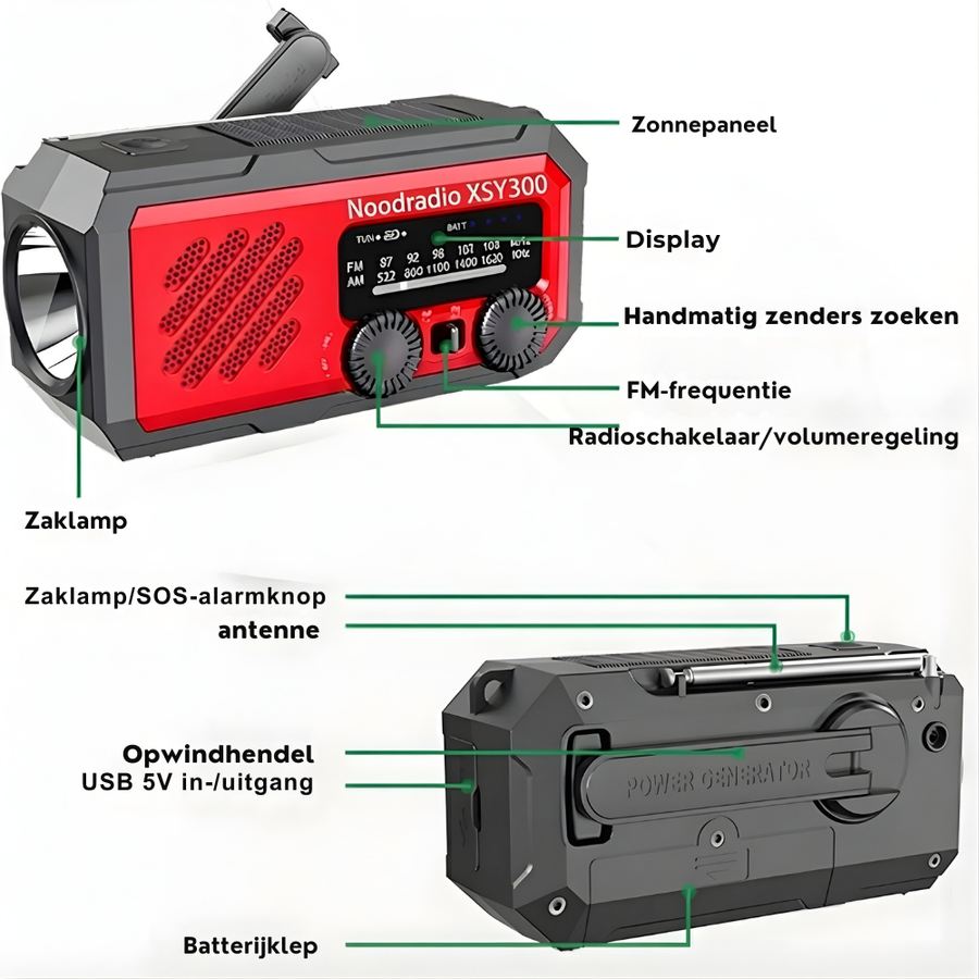 - Altijd energie, zonder stopcontact: laad op via solar of de handzwengel wanneer het stroomnet wegvalt.